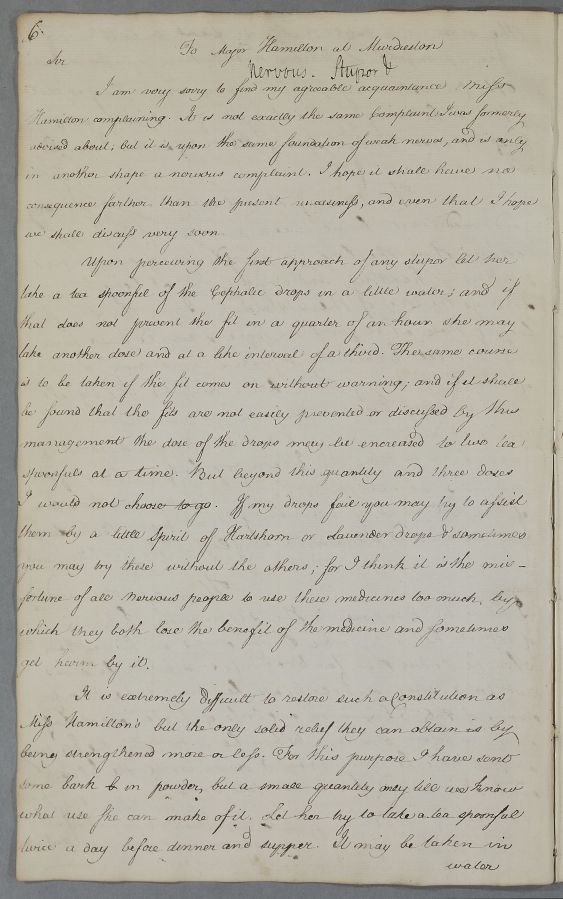 | Summary | Reply 'To Major Hamilton at Murdieston' (James Inglis Hamilton, later General), about the nervous ailments of Miss Hamilton (his older sister Christian), whom Cullen describes as his "agreeable acquaintance". |