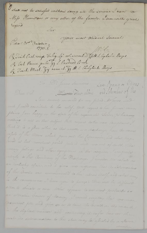 [ID:5966] From: Dr William Cullen (Professor Cullen) / To: Major James Inglis Hamilton ((later) General Hamilton of Murdieston) / Regarding: Miss Christian Hamilton (of Murdieston) (Patient) / 31 October 1770 / (Outgoing)