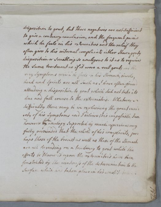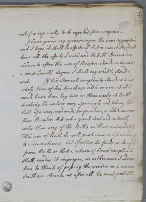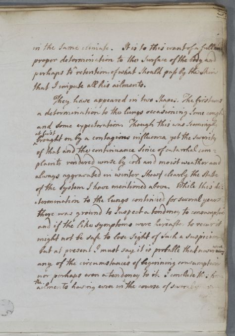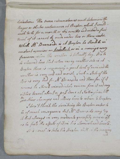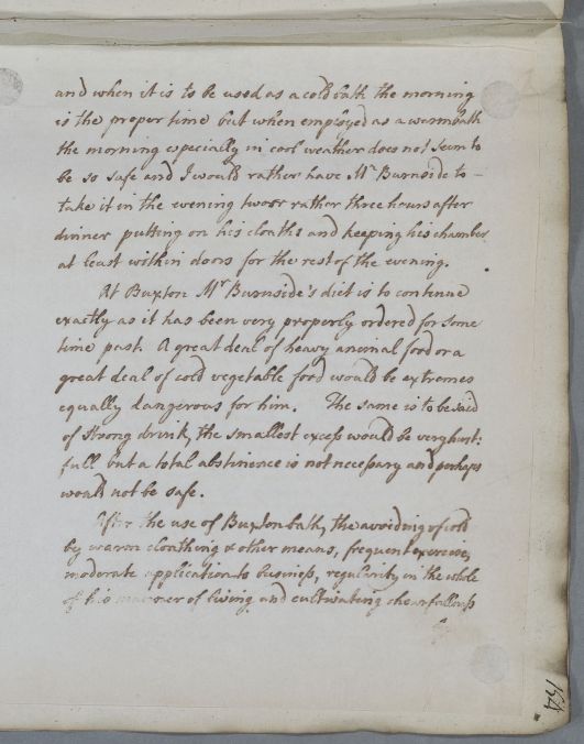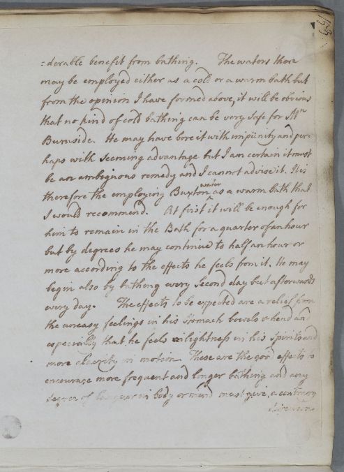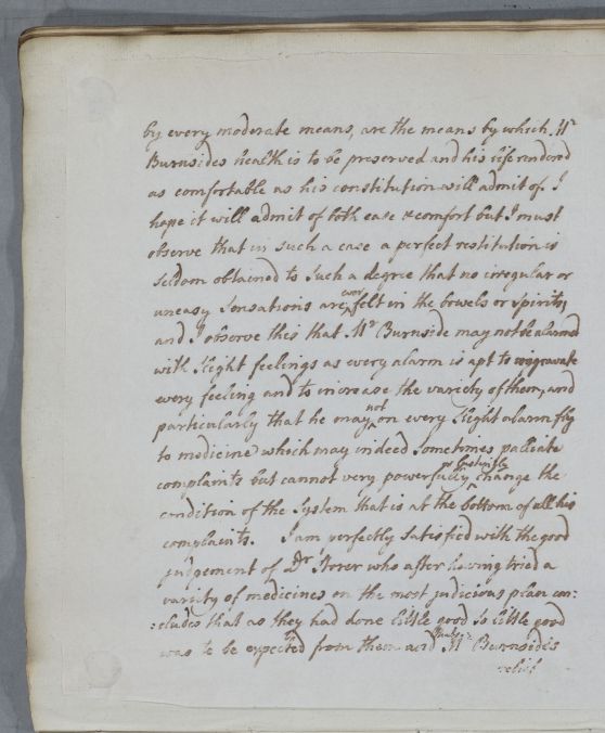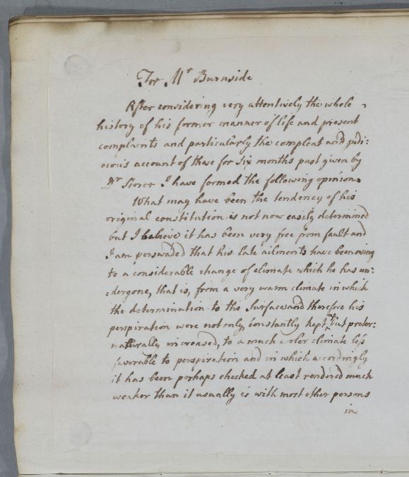 Reply for Mr Burnside. Cullen believes his constitution to have been largely free from fault, and his ailments due to a considerable change of climate. Cullen gives lengthy and detailed directions for the patient, including advice on travelling to Buxton.