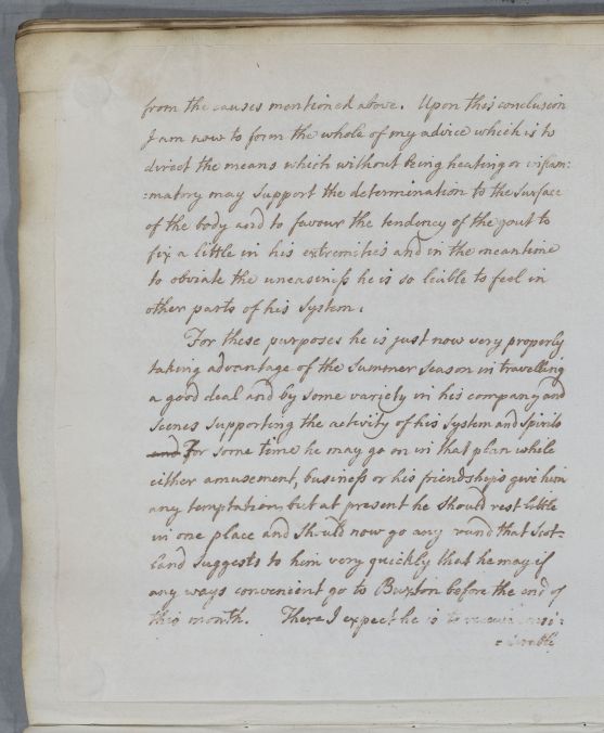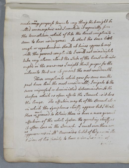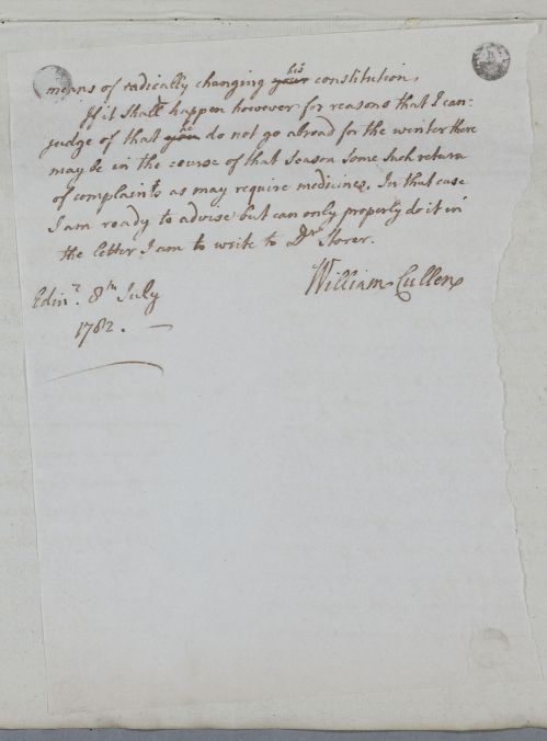 | Summary | Reply for Mr Burnside. Cullen believes his constitution to have been largely free from fault, and his ailments due to a considerable change of climate. Cullen gives lengthy and detailed directions for the patient, including advice on travelling to Buxton. |