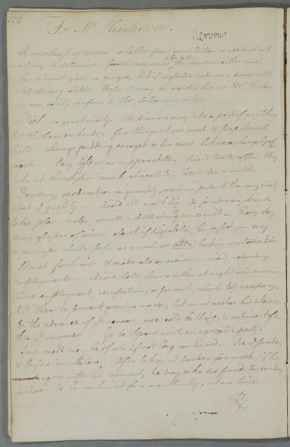 Case of John Henderson whose symptoms include flatulence, 'some degree of Megrims', spitting blood and delicate nerves for which he is advised to travel to Paris. |
