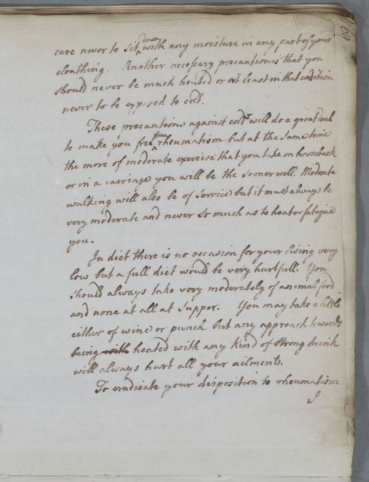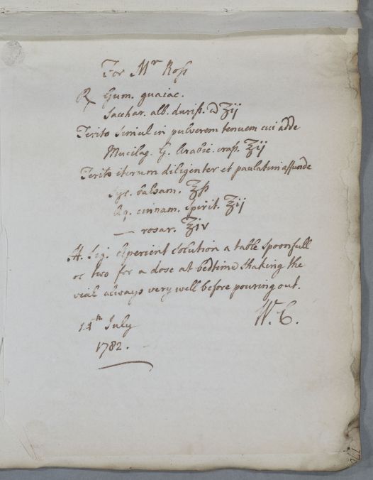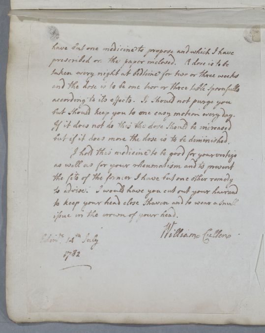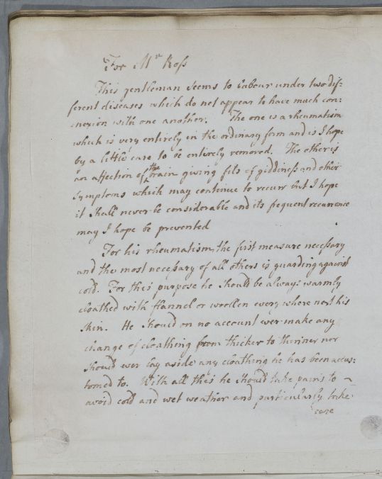 Letter [to Dr Thomas Livingston] for Mr Ross, who in Cullen's opinion seems to be suffering from two different diseases, one being rheumatism and the other 'an affection of the brain giving fits of giddiness'.