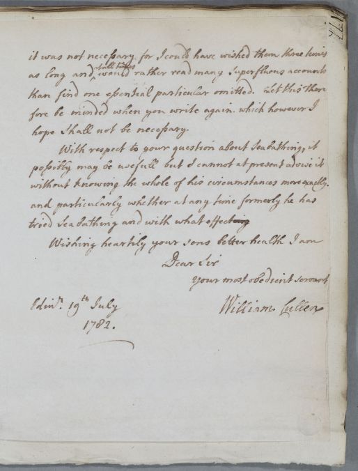 | Summary | Reply to an unnamed correspondent about his son, who suffers from headaches. Cullen requests more information about the illness, and adds that although sea bathing may be useful he cannot advise it without knowing more about the case. Reply made through a Mr Campbell. |