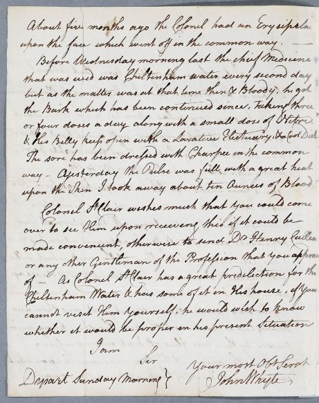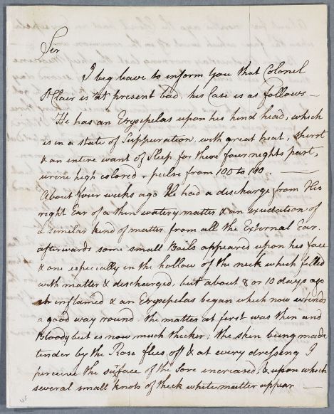 Case of Colonel St Clair who has erysipelas, an ear discharge and boils. |