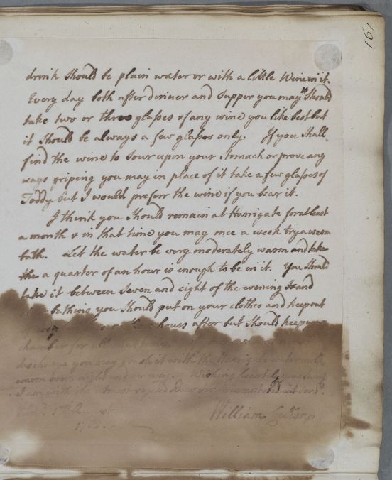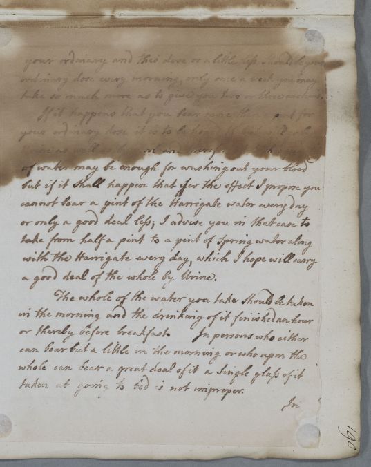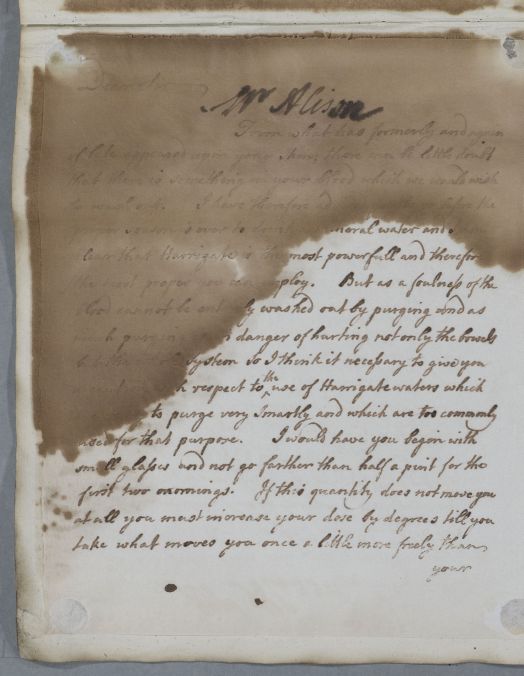 Instructions to Mr Alison, explaining Cullen's belief that 'there is something in your blood which we would wish to wash out' and emphasising that Harrigate mineral water is 'the most powerfull and therefore the most proper you can employ'. Copy badly stained.