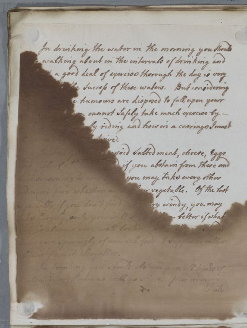 | Summary | Instructions to Mr Alison, explaining Cullen's belief that 'there is something in your blood which we would wish to wash out' and emphasising that Harrigate mineral water is 'the most powerfull and therefore the most proper you can employ'. Copy badly stained. |