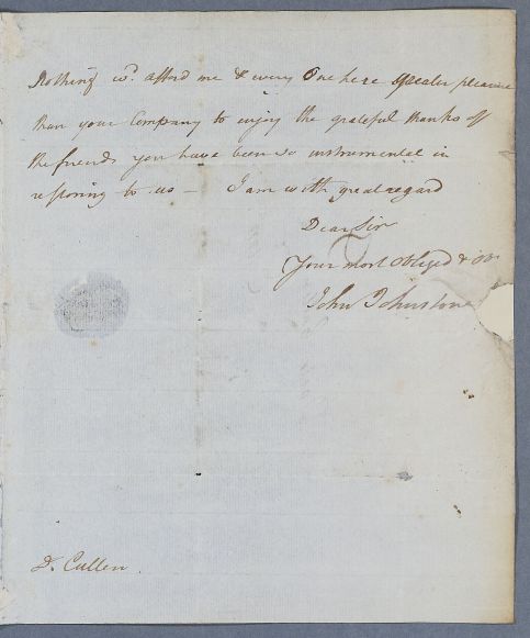 | Summary | Letter from John Johnstone of Alva concerning the case of his sister (Miss Betty), who has improved since Cullen's visit, and his daughter. He is going to Ballindean to fetch his (great)nieces, the Wedderburns of Ballindean, for a visit. Date inferred from circumstantial evidence. |