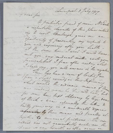 | Summary | Letter from Dr J. Brandreth, concerning 'a case of locked Jaw' in the infirmary in Liverpool. It also gives an account on Mr Heywood and the fate of an earlier patient Mr T. Dickson. |