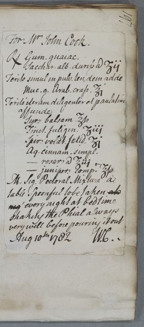 | Summary | Prescription 'For Mr John Cook', for 'pectoral mixture'; probably sent to Dr Charles Keith in Morpeth. This is a draft of [DOC ID:2254]. |