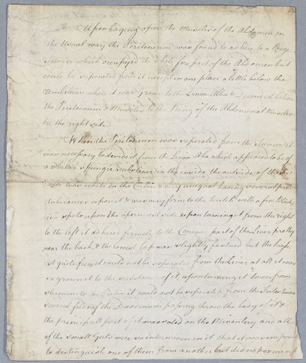 Case of an unnamed patient (deceased) whose body is subjected to a post-mortem examination which reveals a large abdominal tumour. |