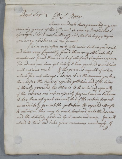 Reply to Dr. Lancelot Aery in which Cullen advises that '[i]f the person is capable of coition which they are not always I advise it in the manner you have been, before the time of expected pollution'.