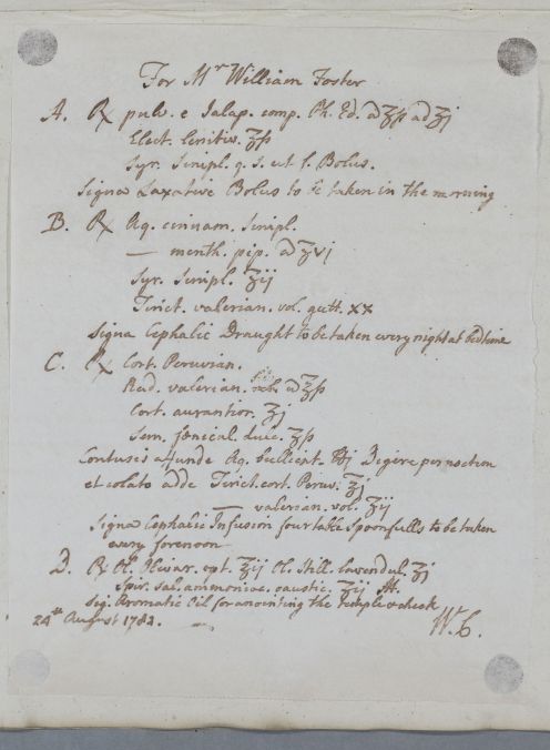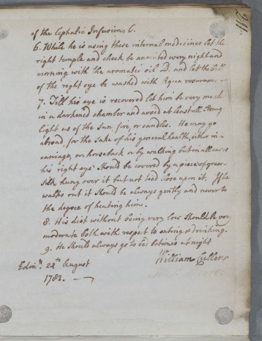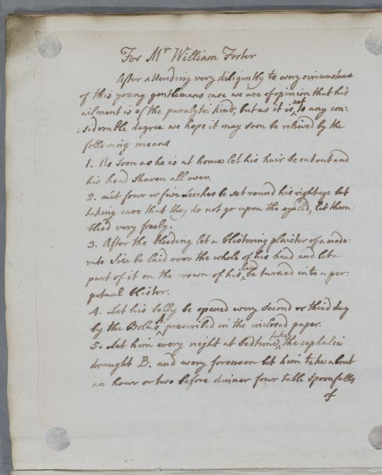 | Summary | Directions on regimen for Mr William Foster in the form of a numbered list. The patient has an ailment of the eye which Cullen believe to be 'of the paralytic kind'; his instructions recommend that his hair should be shaved off and four or five leeches placed around the eye. |