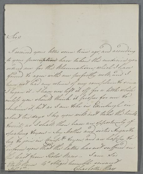 | Summary | Letter from Charlotte Hay, concerning her own case. She also sends the compliments of her mother and her sister Augusta 'who has not suffered in the least from Kelso Races'. |