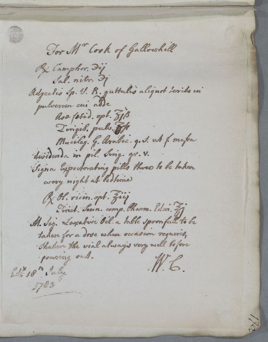 Prescription 'For Mr John Cook', for 'expectorating pills' and a laxative; probably sent to Dr Charles Keith in Morpeth.
