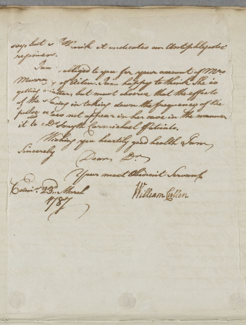 [ID:6280] From: Dr William Cullen (Professor Cullen) / To: Dr Colin Robertsone (Robertson) / Regarding: Mrs Mary Murray (Ogilvie) (Honourable Mrs Murray of Aiton (Ayton)) (Patient) / 23 March 1787 / (Outgoing)