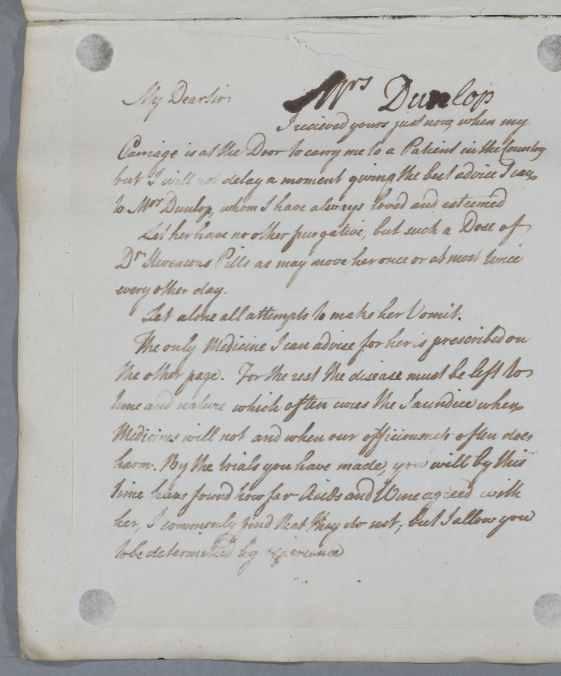 [ID:629] From: Dr William Cullen (Professor Cullen) / To: Mr John Dunlop (of Dunlop) / Regarding: Mrs Frances Anna Dunlop (Wallace) (of Dunlop) (Patient) / 26 August 1782 / (Outgoing)