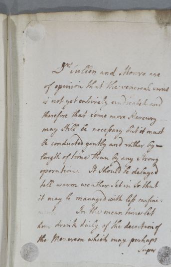 | Summary | An untitled letter, referring to a male patient. Notes that 'Dr Cullen and Monro are of opinion that the venereal virus is not entirely eradicated', and recommend more mercury and use of mezereon, the preparation of which is described. Cicumstantially, but not certainly linked to Case 1433. |