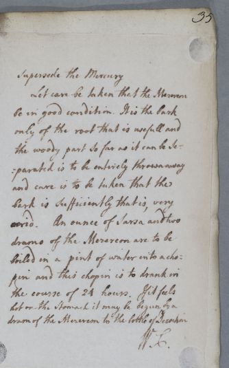 An untitled letter, referring to a male patient. Notes that 'Dr Cullen and Monro are of opinion that the venereal virus is not entirely eradicated', and recommend more mercury and use of mezereon, the preparation of which is described. Cicumstantially, but not certainly linked to Case 1433.