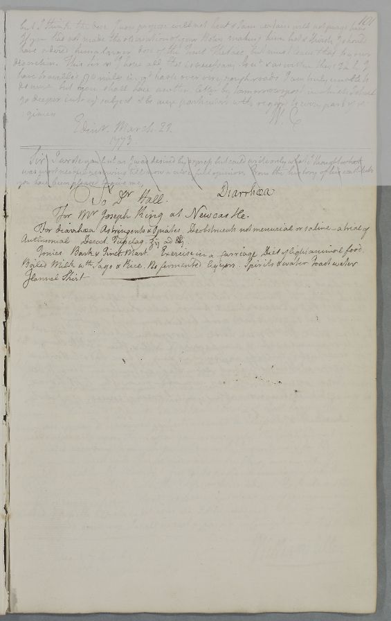 Reply, 'To Dr Hall for Mr Joseph Hall of Newcastle' with list of medical ingredients compunds to try, and brief summary of dietry and lifestyle advice. Precise date is merely a supposition bases on the position in casebook.