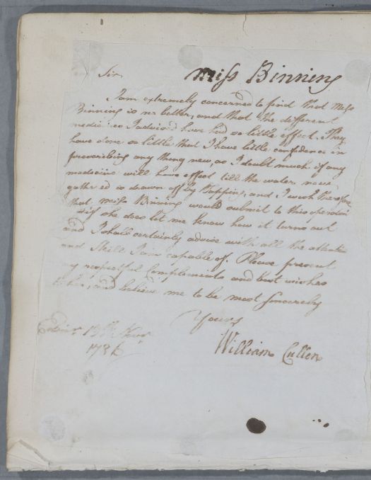 [ID:5358] From: Dr William Cullen (Professor Cullen) / To: Thomas Logan / Regarding: Miss Betty Binning (of Haws) (Patient) / 13 November 1786 / (Outgoing)