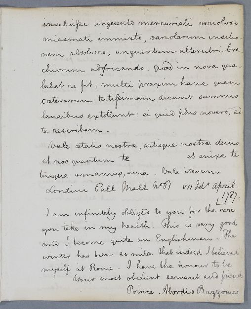 [ID:6299] From: Dr Antonio Giuseppe Testa / To: Dr William Cullen (Professor Cullen) / Regarding: Prince Abbondio Rezzonico (Patient) / 7 April 1787 / (Incoming)