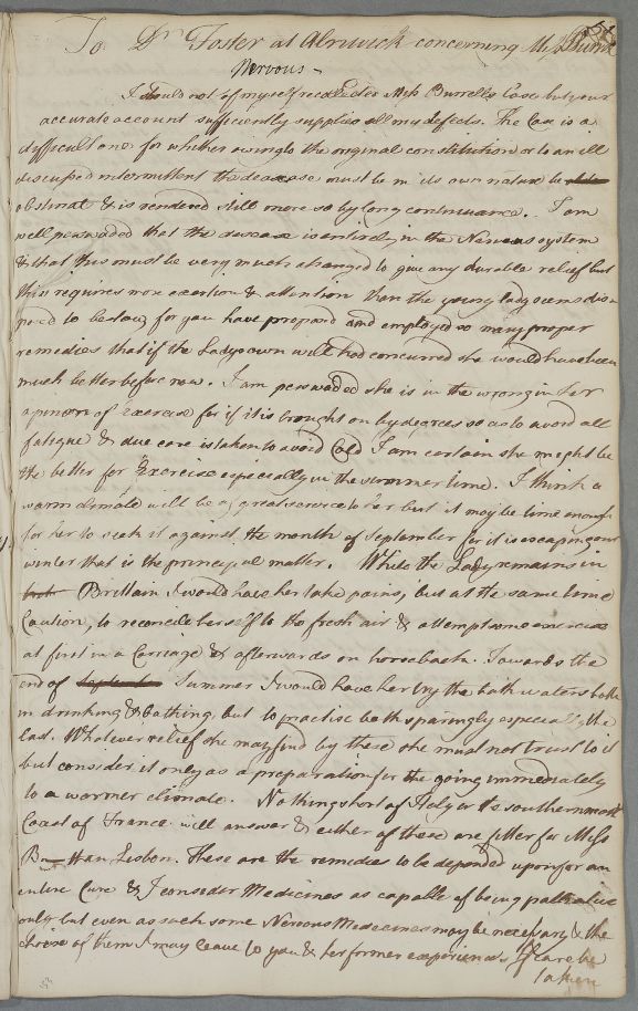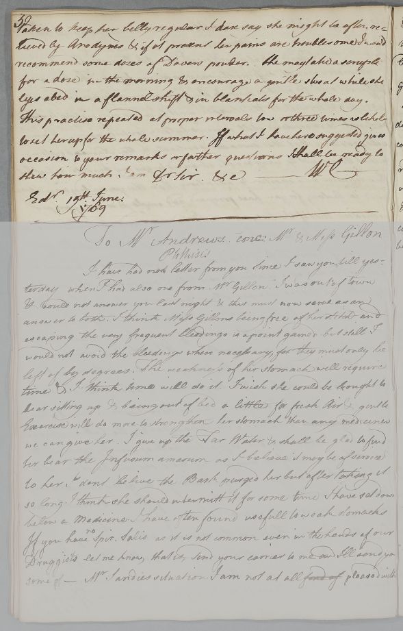 [ID:63] From: Dr William Cullen (Professor Cullen) / To: Dr Joseph Foster (Forster) / Regarding: Miss Burrell (Patient) / 19 June 1769 / (Outgoing)