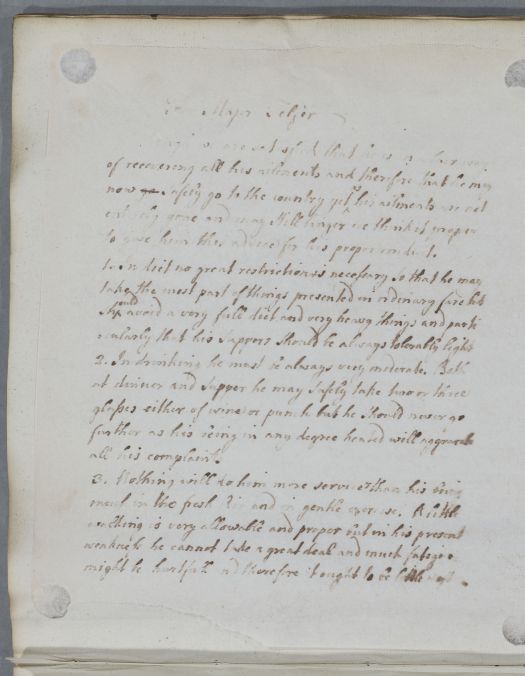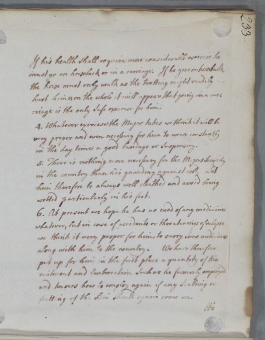 Instructions for Major Telfer, chiefly on diet, exercise and avoiding cold.
