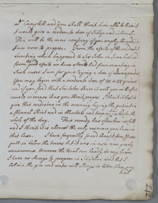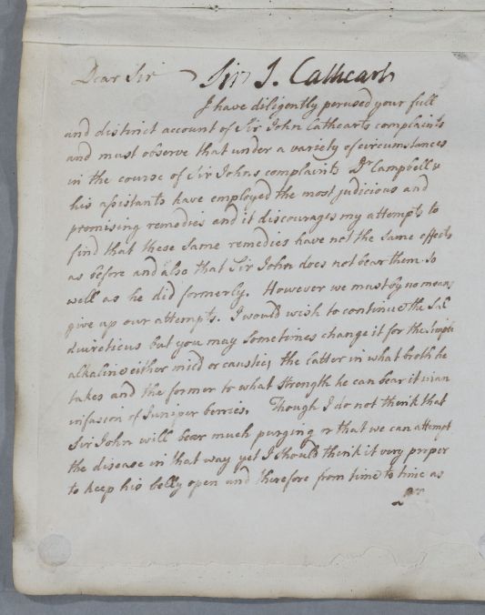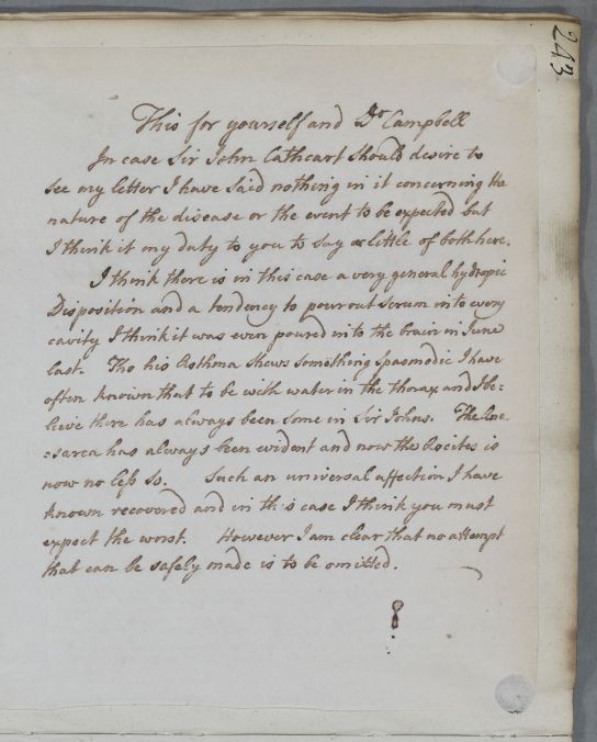 | Summary | Reply 'For Sir J[ohn] Cathcart', who has already been treated by a Dr Cambell and his assistants. An enclosed letter for 'yourself and Dr Campbell' explaining that in case Sir John wanted to read the main letter, there was nothing in it on the nature of his disease or of 'the event to be expected', but that this was briefly detailed in the addition. |