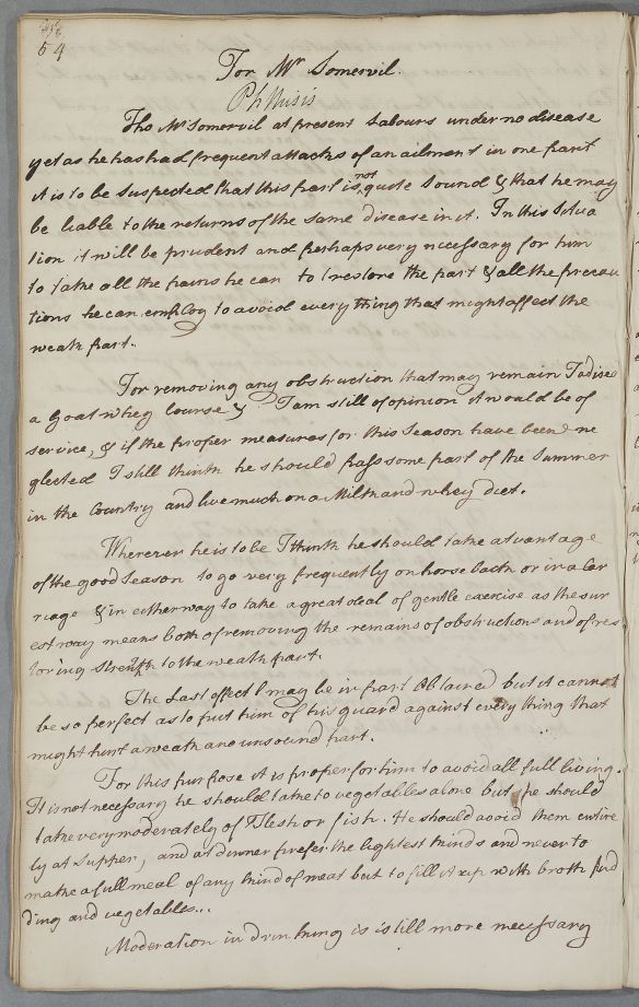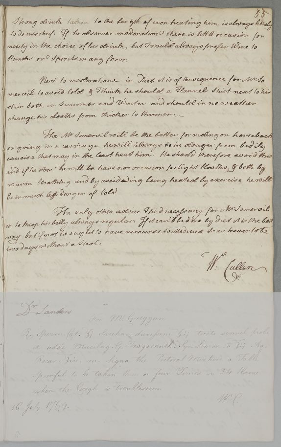 [ID:65] From: Dr William Cullen (Professor Cullen) / To: [ADDRESSEE UNKNOWN] / Regarding: Mr Somerville (Somervil) (Patient) / 30 August 1769 / (Outgoing)
