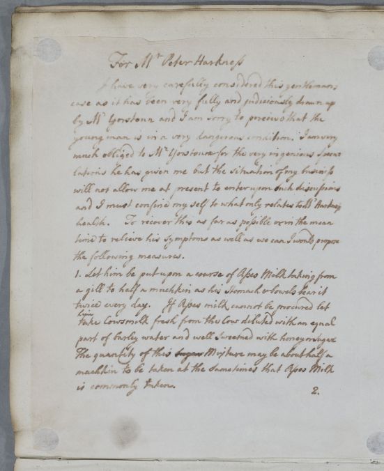 Directions for Mr Peter Harkness, whose case has been drawn up by Mr [Yestour?]. Instructions are largely dietary, beginning with a course of asses' milk.