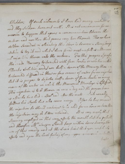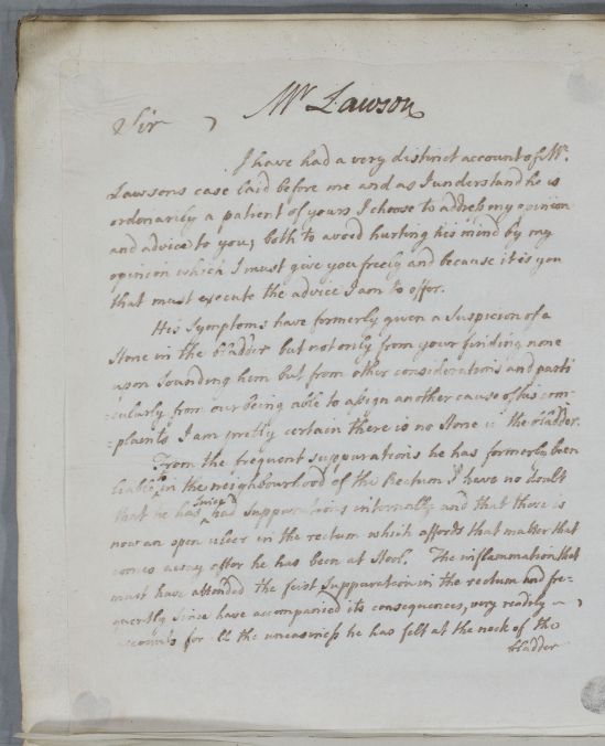 Letter to an unnamed physician about one of his patients, Mr Lawson. Cullen thinks his symptoms seem to imply a stone in the bladder, but is certain this is not the case, and suspects an ulcer in the rectum instead.