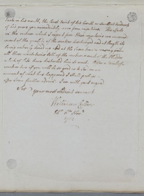 | Summary | Letter to an unnamed physician about one of his patients, Mr Lawson. Cullen thinks his symptoms seem to imply a stone in the bladder, but is certain this is not the case, and suspects an ulcer in the rectum instead. |