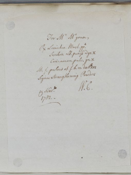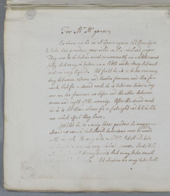 Case of Mr Robert McGouan [McGoun, McGowan] who is prescrbed strengthening powders. In 1785 he reports he is no worse for taking them but passes worms and is considering going south for his health. |