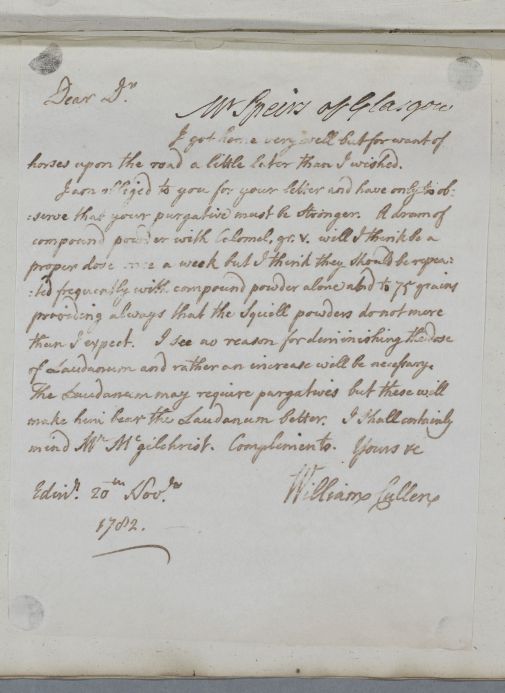 | Summary | Short reply to Mr Speirs concerning treatment with purgatives. |