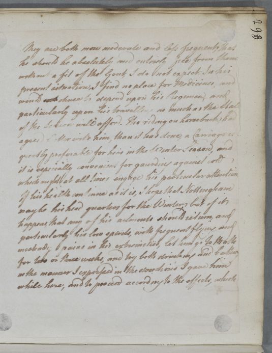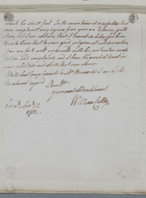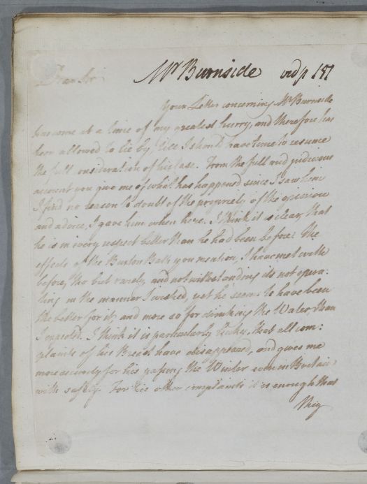 | Summary | Letter to [Dr John Storer] regarding Mr Burnside's case. Cullen is confident in his earlier advice, but recommends that if any of the patient's ailments return, particularly his 'low spirits', that he should go to Bath for several weeks. |