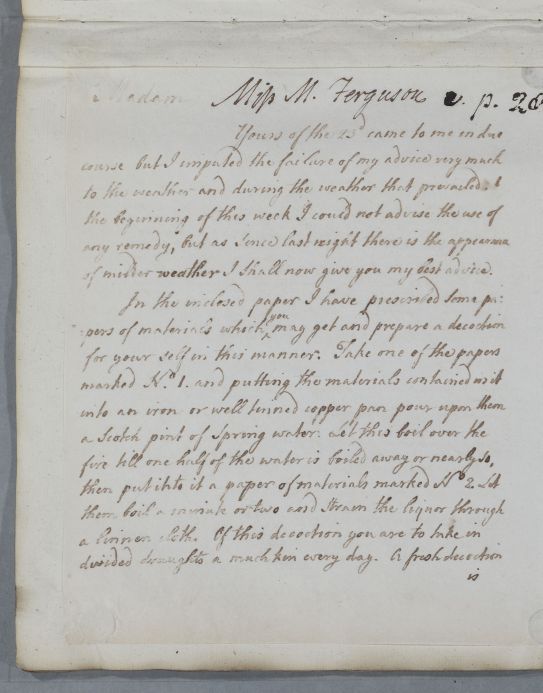 Reply, for 'Miss M. Ferguson v. p. 28[2]'. Cullen advises Miss Ferguson on taking the medicines prescribed. A postscript adds 'Tho I have sent you the prescription as if you were to get the medicines at Dumfermline I believe it would be more secure for you to get them from Edinburgh'.