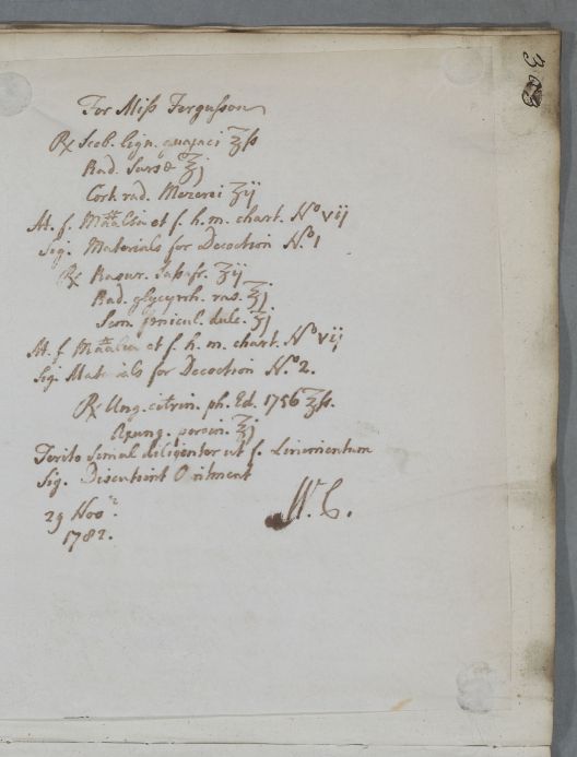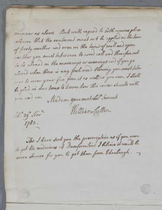 | Summary | Reply, for 'Miss M. Ferguson v. p. 28[2]'. Cullen advises Miss Ferguson on taking the medicines prescribed. A postscript adds 'Tho I have sent you the prescription as if you were to get the medicines at Dumfermline I believe it would be more secure for you to get them from Edinburgh'. |