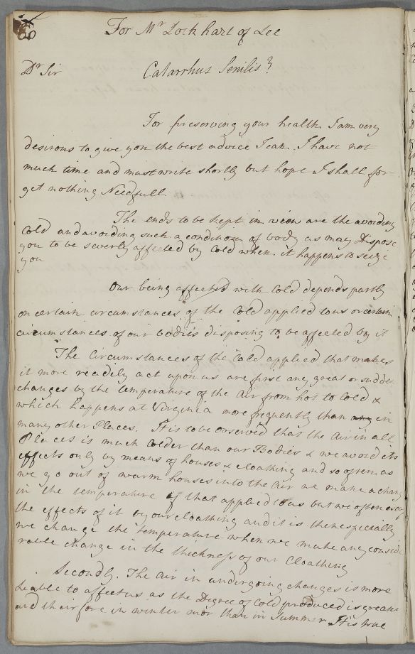 | Summary | Reply 'For Mr Lockhart of Lee', giving advice on avoiding cold. |