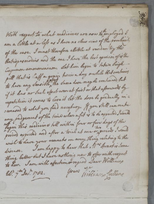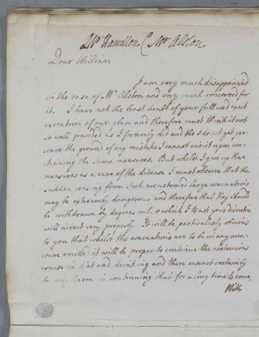 | Summary | Reply to the physician, 'William [Hamilton]', concerning the case of Mr Alston. Cullen is very disappointed not to have seen any improvement, and is very concerned for his health. he proposes cuprum ammoniacum as an antispasmodic for his fits. He is happy to hear that Mrs Arnot (Mr Alston's sister) is somewhat better, but 'I have nothing new to offer with respect to her'. |