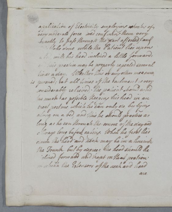 Reply regarding the treatment of Mr. J. B., whose case Cullen believes to have been 'brought on by a general rheumatic Diathesis', but to be now' very much a local affection of the Muscles employed in keeping the head and neck erect'.