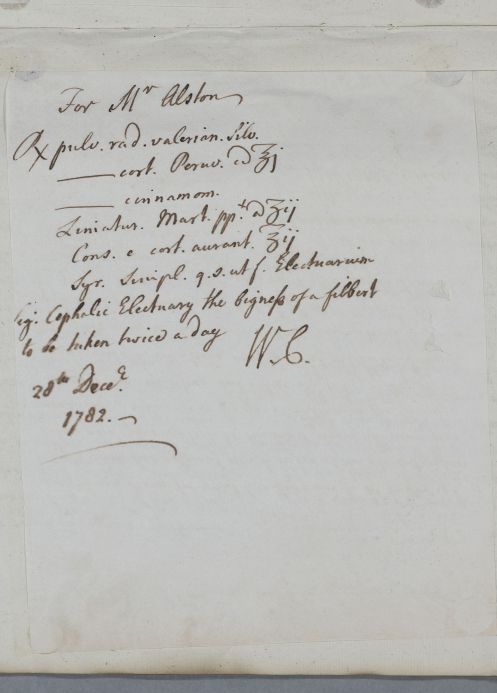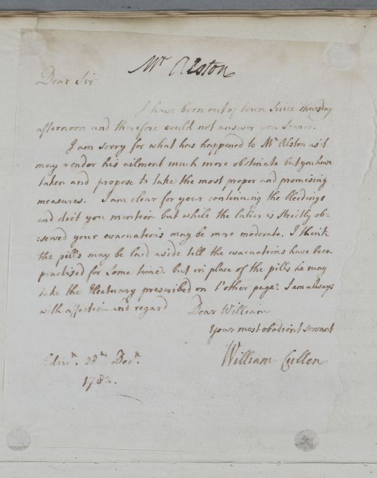 | Summary | Reply, brief, to William Hamilton regarding the ongoing case of Mr Alston; Cullen agrees with the current treatment, and encloses a cephalic prescription. |
