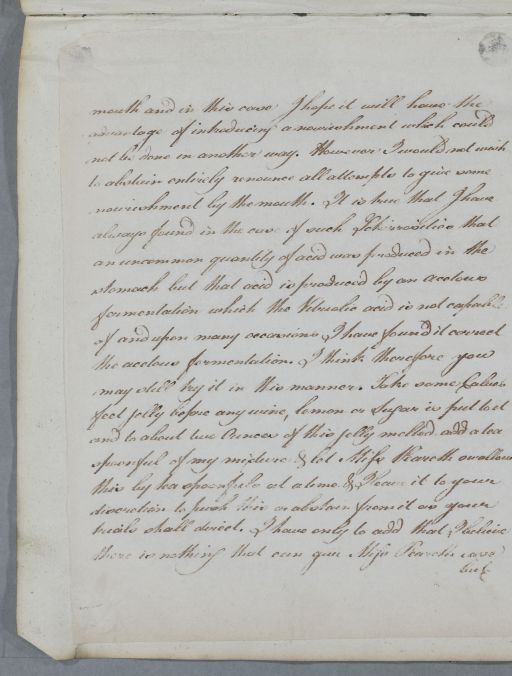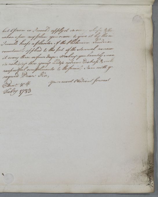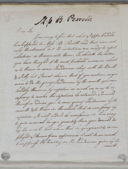 Reply to the surgeon William Ingham regarding the ongoing treatment of Miss [Barbara] Peareth Cullen comments, 'I am sorry to find that what I apprehended has happened to Miss B Pearith and that now not ony the stomach but the intestines are ready to reject whatever is thrown at them'. He advises that she be given no more laudanum by mouth, but to give it by injection instead.