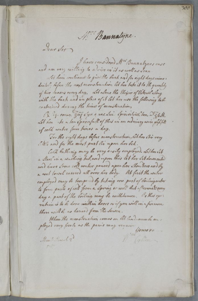| Summary | Reply, probably to an unnamed practitioner, with directions, including bathing, for Mrs Bannatyne who has menstrual pains. |