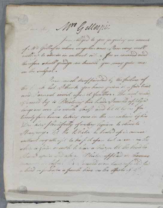 | Summary | Letter to a physician regarding the case of his patient, annotated as being a 'Mrs Gillespie', but this appears to be incorrect as the letter itself refers to a Mr Gillespie who is being blistered for sciatica. Also mentions Dr Boerhaave treating himself. |