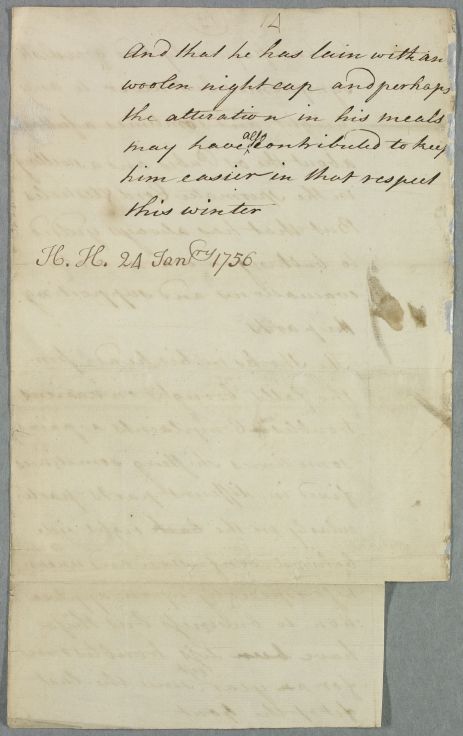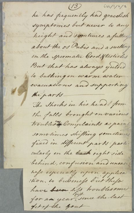 Pages 13 and 14 of what must have been a substantial case-history of which the rest is missing. The vocabulary suggests it was composed by a professional physician and it may have been sent to Cullen as part of an extended case-history. However the handwriting has not been traced (though possibly that of John Hope, who attended Hopetoun). The dateline gives the address as 'H.H.', which may be Hopetoun House. The layout and unusual size of the paper matches that of a later letter by John Hope, 2nd Earl of Hopetoun.