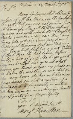 [ID:735] From: Miss Margaret Hamilton / To: Dr William Cullen (Professor Cullen) / Regarding: Miss Agnes Hamilton (Nany, Nanny, of Westburn) (Patient) / 24 March 1756 / (Incoming)
