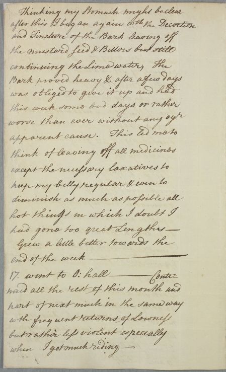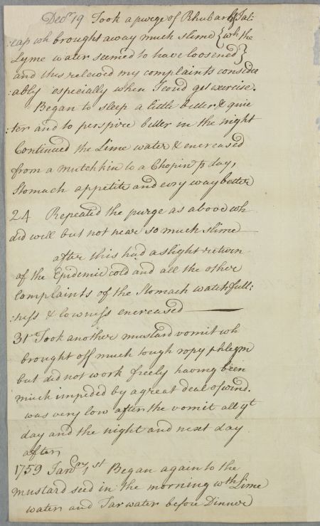 Lengthy letter from John, 2nd Earl of Hopetoun, describing his symptoms in the form of a diary. He mentions that he 'had not got quite free of the Cough and other effects of the Epidemic, besides the other complaints of Lowness and Oppression'.
