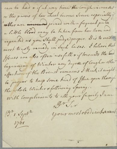 | Summary | Reply, in form of unsigned, retained draft (the opening possibly missing) by Cullen regarding the case of a Mrs Malcolm, who suffers from respiratory problems. Cullen suggests that in such cases 'I find no irritations more dangerous than bodily Exercise' and suggests she 'avoid the hurry anxiety & various irritation of family affairs'. |