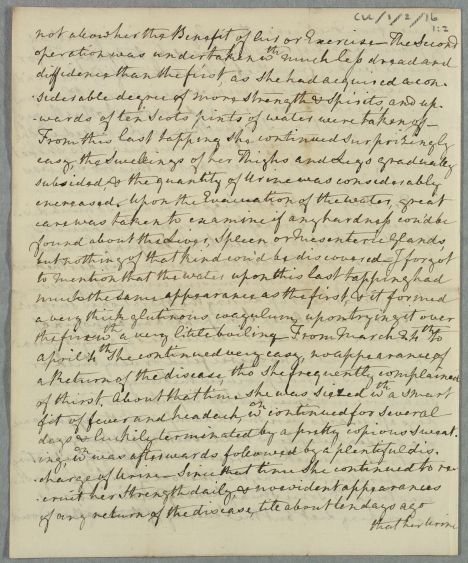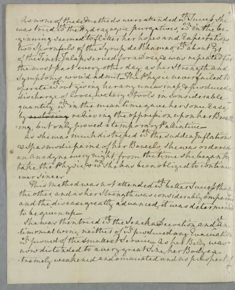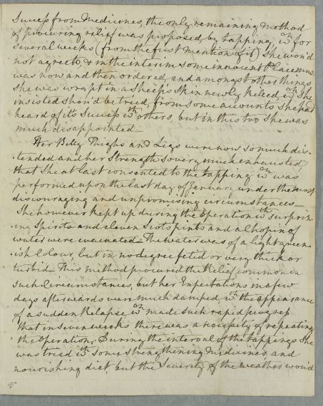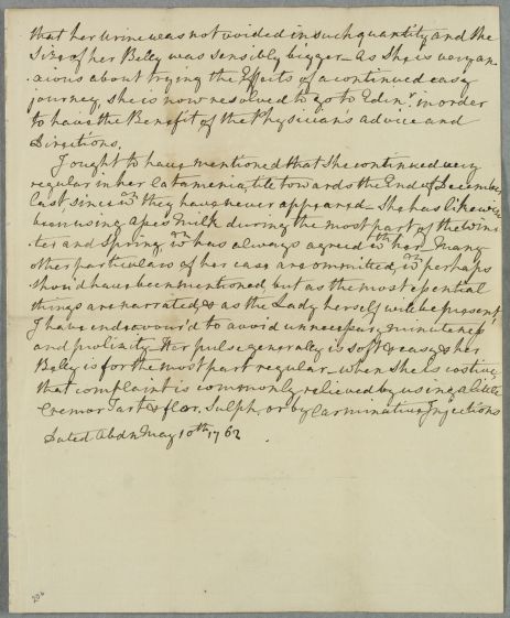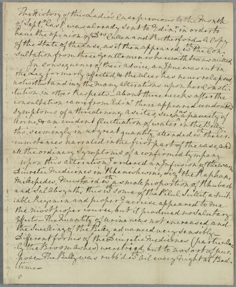 | Summary | Unsigned letter from Aberdeen, describing the case of Mrs L, whose history was already sent to Edinburgh in the previous September for the perusal of Cullen and Rutherford. Letter describes her current condition and the treatments given, including a surgical 'tapping' to remove abdominal dropsy. |