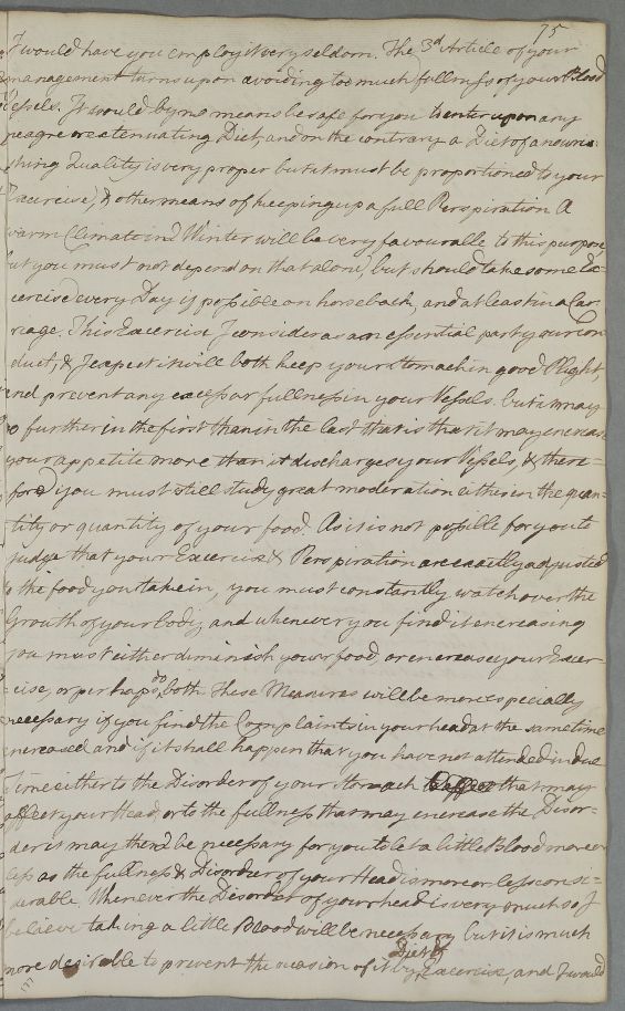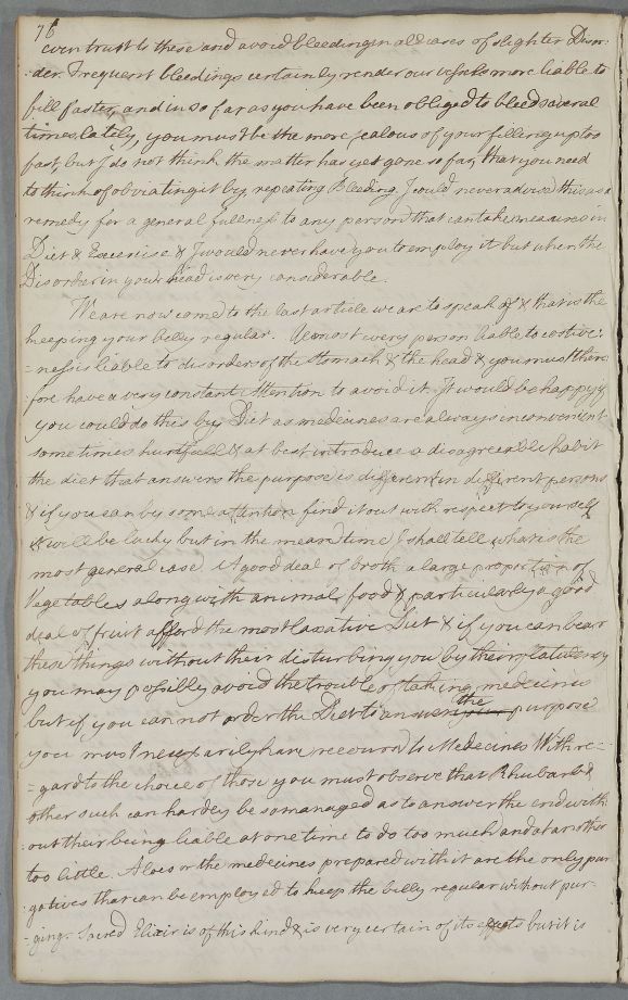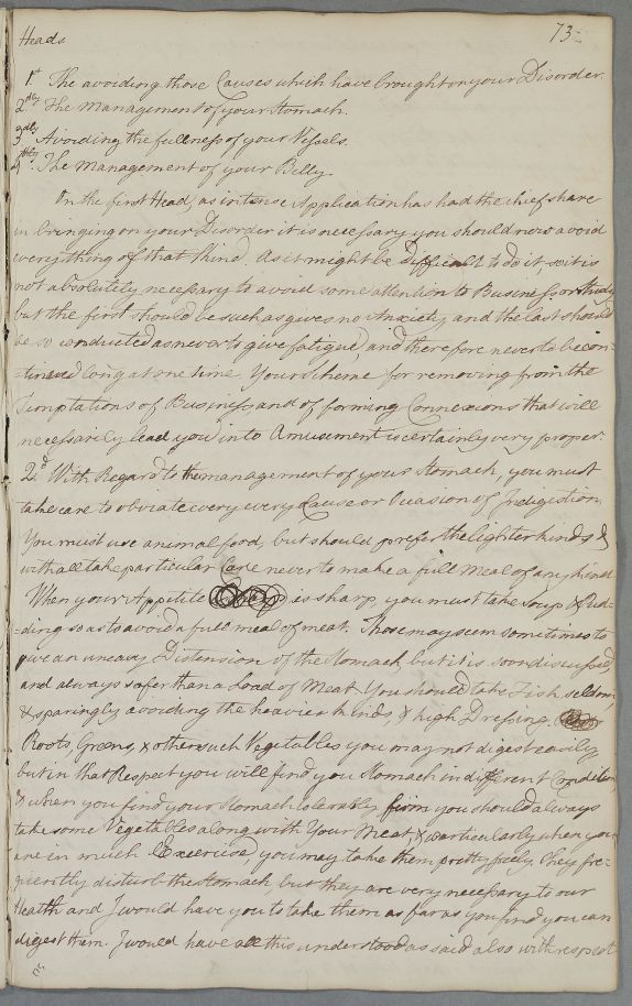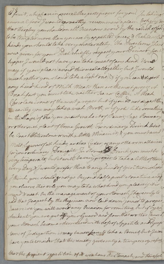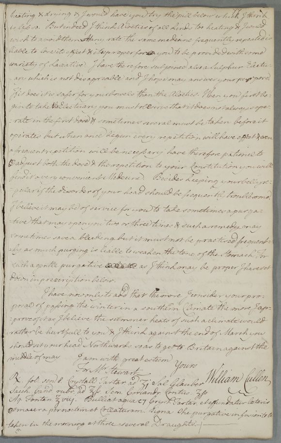 | Summary | Reply 'For Mr Andrew Stewart', concerning diet and exercise as treatment for dyspepsia and plethora, with three recipes (purgative and laxative). He is also advised to winter in a warmer climate. |